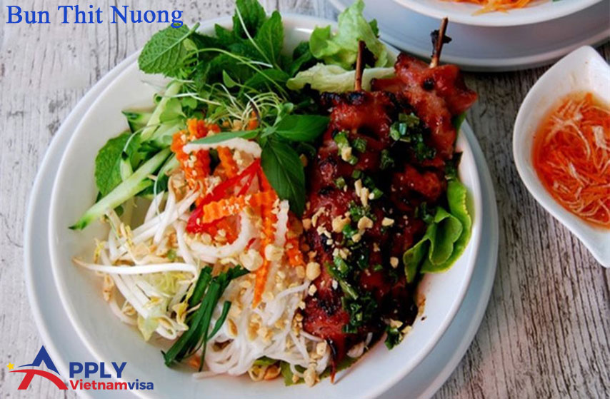 Unlike most noodle dishes, Bun Thit Nuong is not a soup or broth. It is a dish comprised vermicelli rice noodles, bean sprouts, lettuce, basil, sliced cucumber, pickled daikon, chopped peanuts, and mint, topped with grilled pork shoulder. It is used with Nuoc Cham sauce.