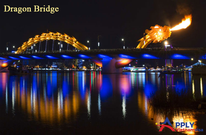 This is the new bridge finished in 2013, connecting Da Nang airport to My Khe Beach and Marble mountain. There is the performance of spewing the fire of Dragon at 21:00 PM on Saturday, Sunday and Occasions.
